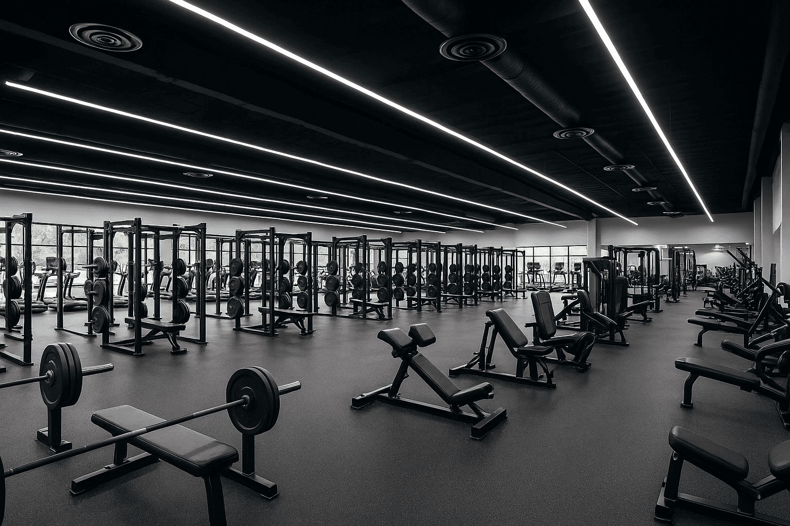 The environment includes expansive strength zones, cardio areas, functional training spaces, Olympic platforms, and a complete lineup of free weights and auxiliary tools — all arranged within an open, movement-driven layout that supports both individual training and high-intensity performance flow.